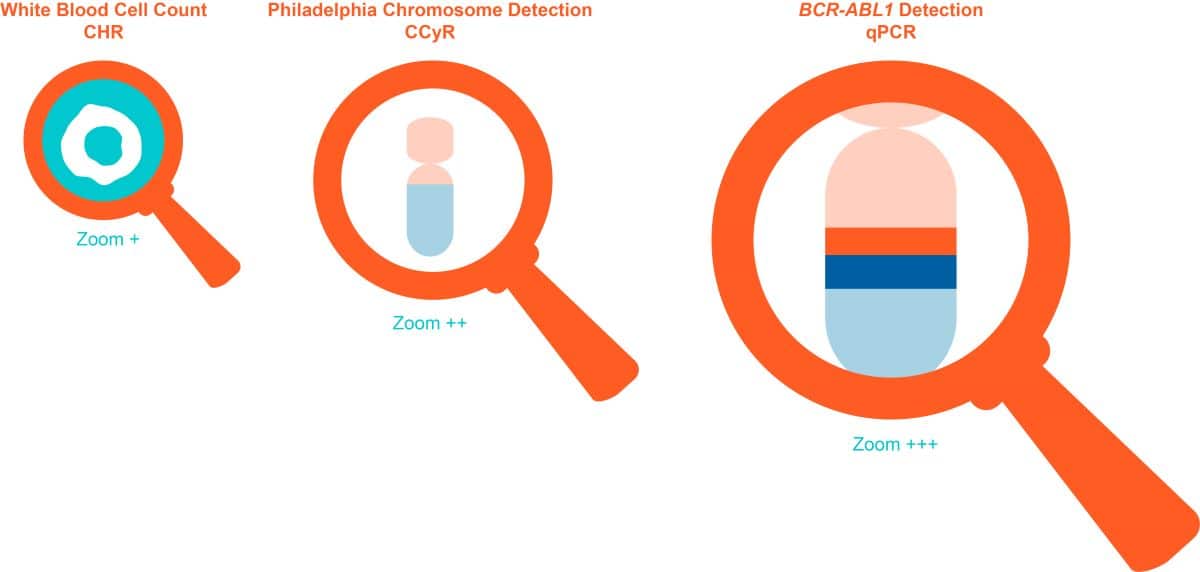 In order to measure very small amounts of leukemia molecules that are in the body, molecular methods (e.g. PCR, qPCR, and RT-qPCR) are used by many laboratories. PCR can be a very sensitive and accurate laboratory method used to estimate the amount of leukemia molecules, called “BCR-ABL1”, in the body. These molecules come from the Philadelphia chromosome. So, the lower the amount of BCR-ABL1, the less leukemia is present. The good news is that the PCR test is performed with a blood sample.