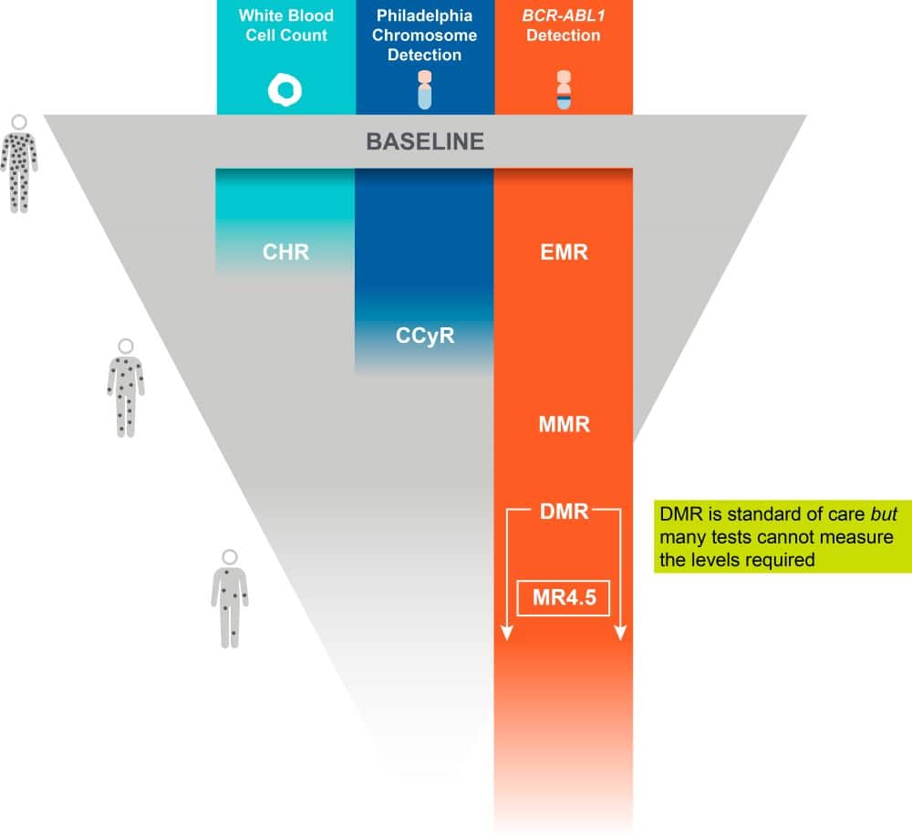 MR4.5 is a measure of very low remaining BCR-ABL1 molecules. It’s equivalent to 0.0032%IS, roughly 32,000-fold reduced from diagnosis. In clinical studies so far, none of the CML patients who achieved MR4.5 progressed to advanced phase CML.7,8,9,10 Though there is no cure for CML, MR4.5 is the deepest form of “safe harbor” that can be measured. Importantly, CML treatment guidelines require that the patient have access to a PCR test with a sensitivity of at least MR4.5 if they want to discuss stopping treatment with their doctor.3