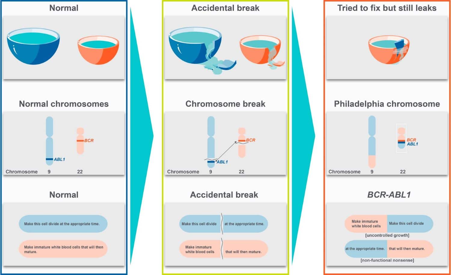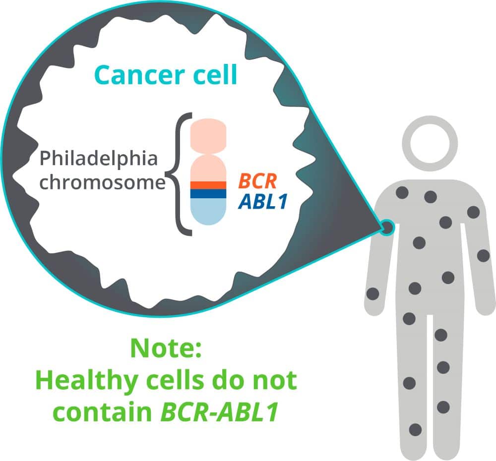 - BCR-ABL1: abnormal genetic molecule created by the Philadelphia chromosome that cause CML, sometimes called a “fusion gene”