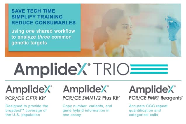 The AmplideX® TRIO Workflow brings simplicity and scalability to FMR1, SMN1/2, and CFTR analysis and is optimized for use on widely established laboratory equipment. AmplideX Reporter further streamlines data reporting with automated analysis modules to deliver genetic results from DNA in under one day.