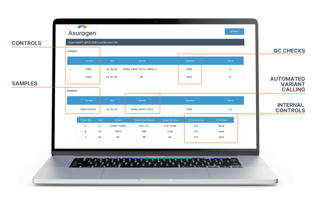 The QuantideX qPCR ESR1 exoMutation Kit’s ready-to-use design doesn’t stop at the bench. Our push-button, automated software, created to run on commonly used operating systems, takes the guesswork and hands-on time out of data analysis. The software module is included with the assay and does not require separate purchases or licenses.